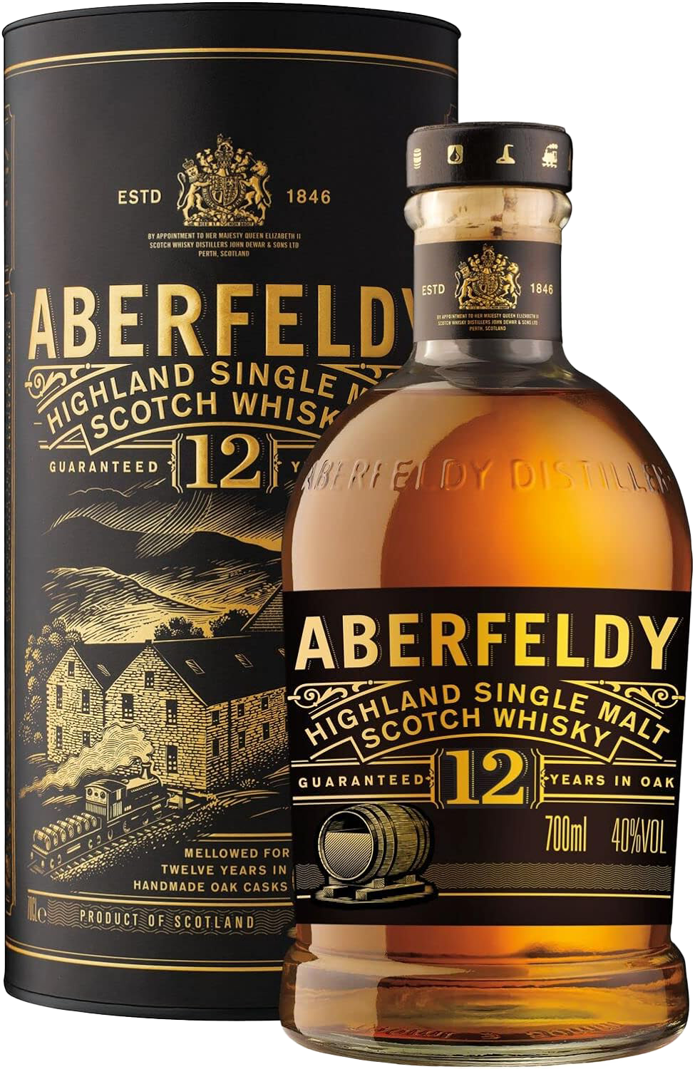 A 12 éves Aberfeldy whisky Skóciából származik és egy tipikus felföldi ital, amely korlátozott mennyiségben kapható. John Dewar alapította a lepárlót több mint száz évvel ezelőtt, 1898-ban. Az Aberfeldy egyedülállóan kombinálja a friss forrásvizet a mézes lágyságú kiváló minőségű single malt whisky-vel.